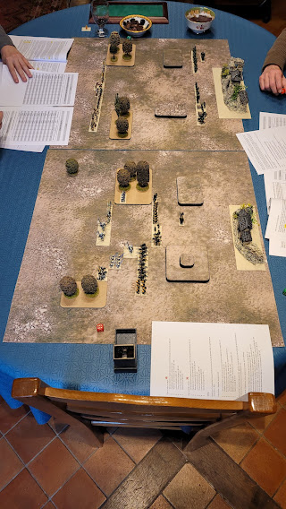 Quatre Compagnons-joueurs avec des armées HOTT (sur l'univers de "Okko"), se sont affrontés sur deux tables de jeu (dans les faits, il n'y avait qu'une table, mais avec deux plateaux - qui étaient des nappes-).😒